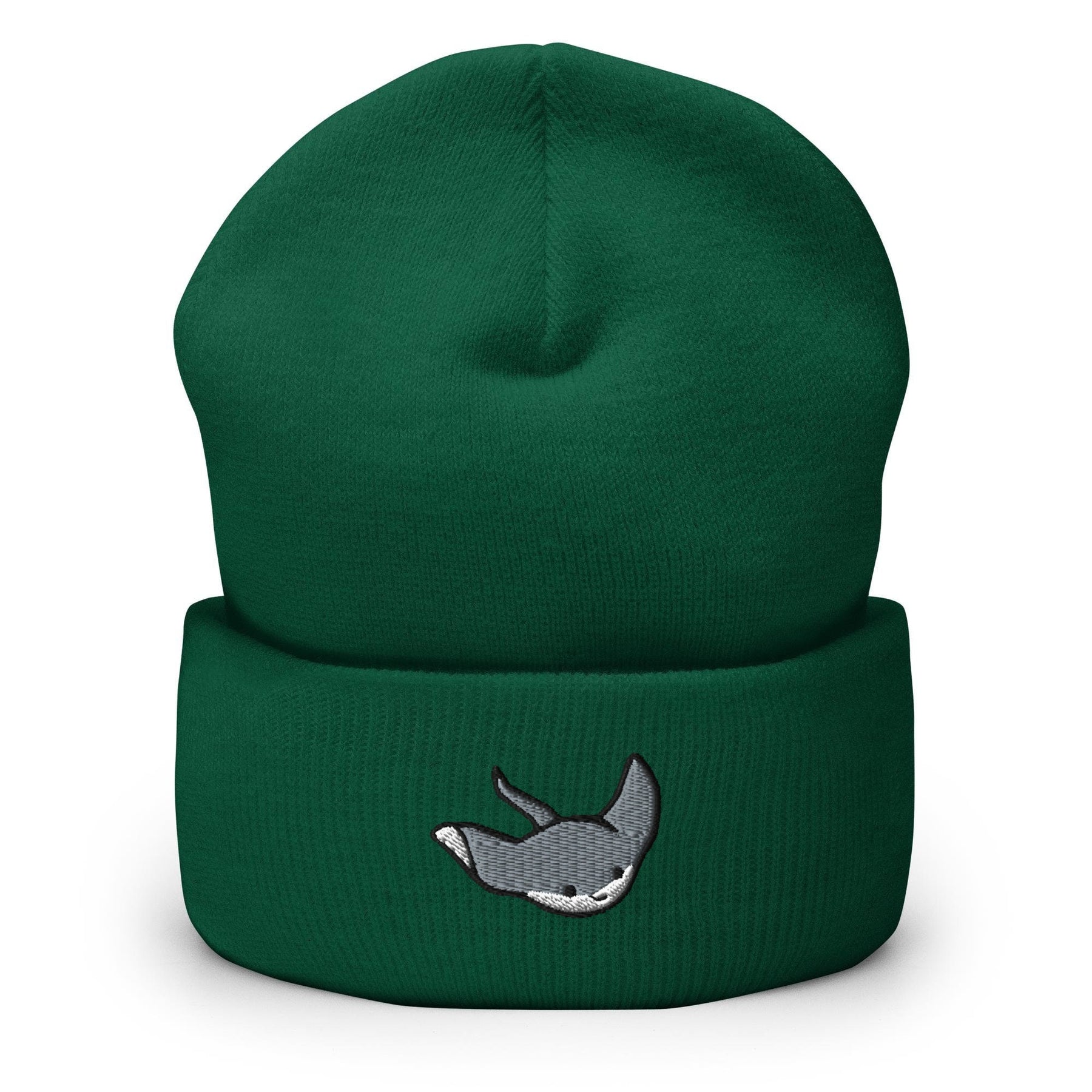 a green beanie with a grey whale on it