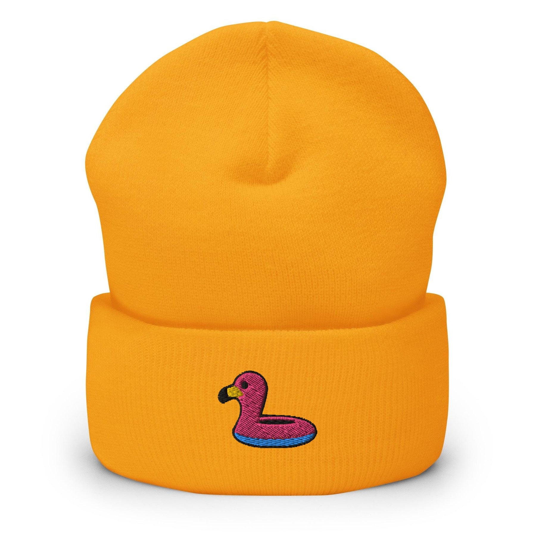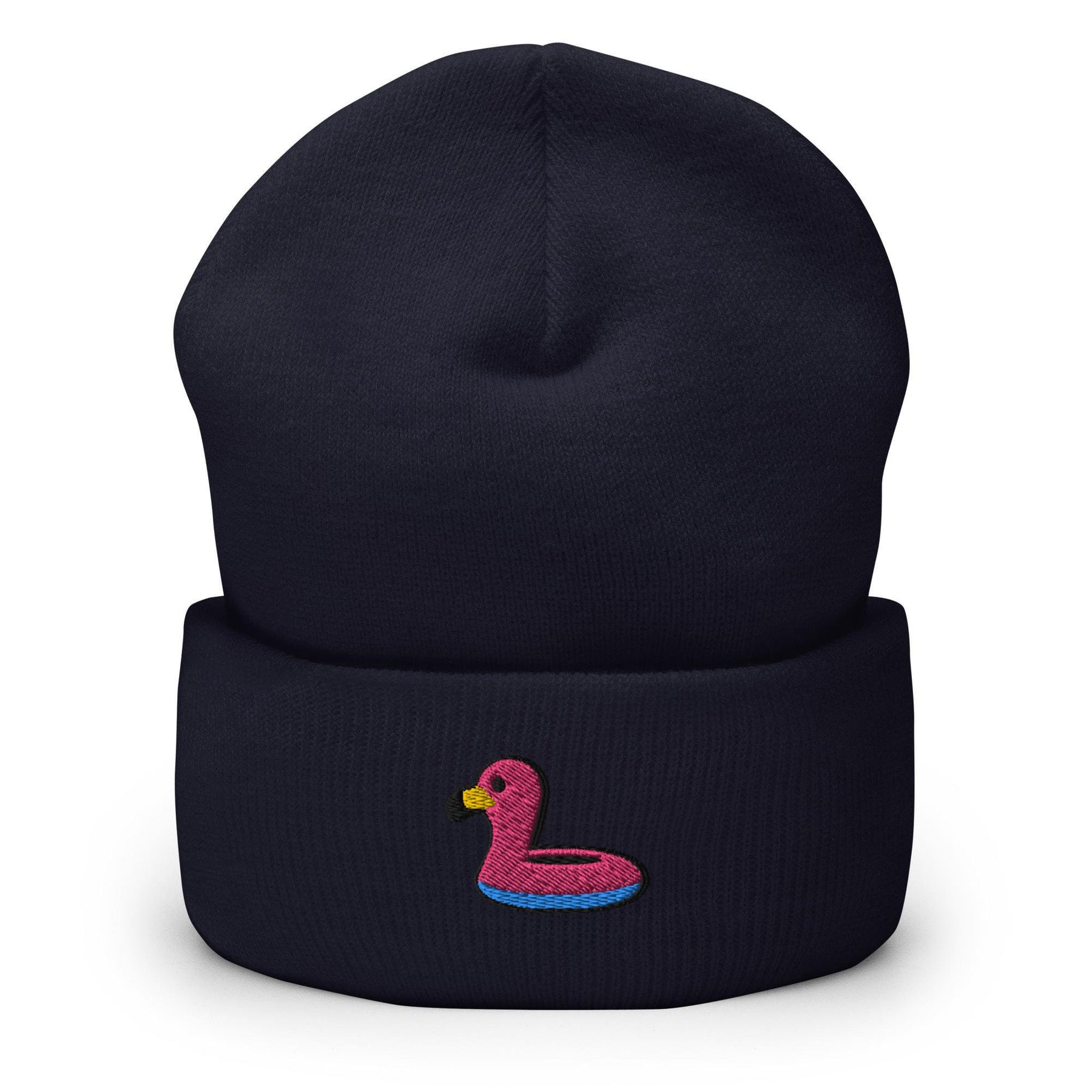 a blue beanie with a pink flamingo embroidered on it