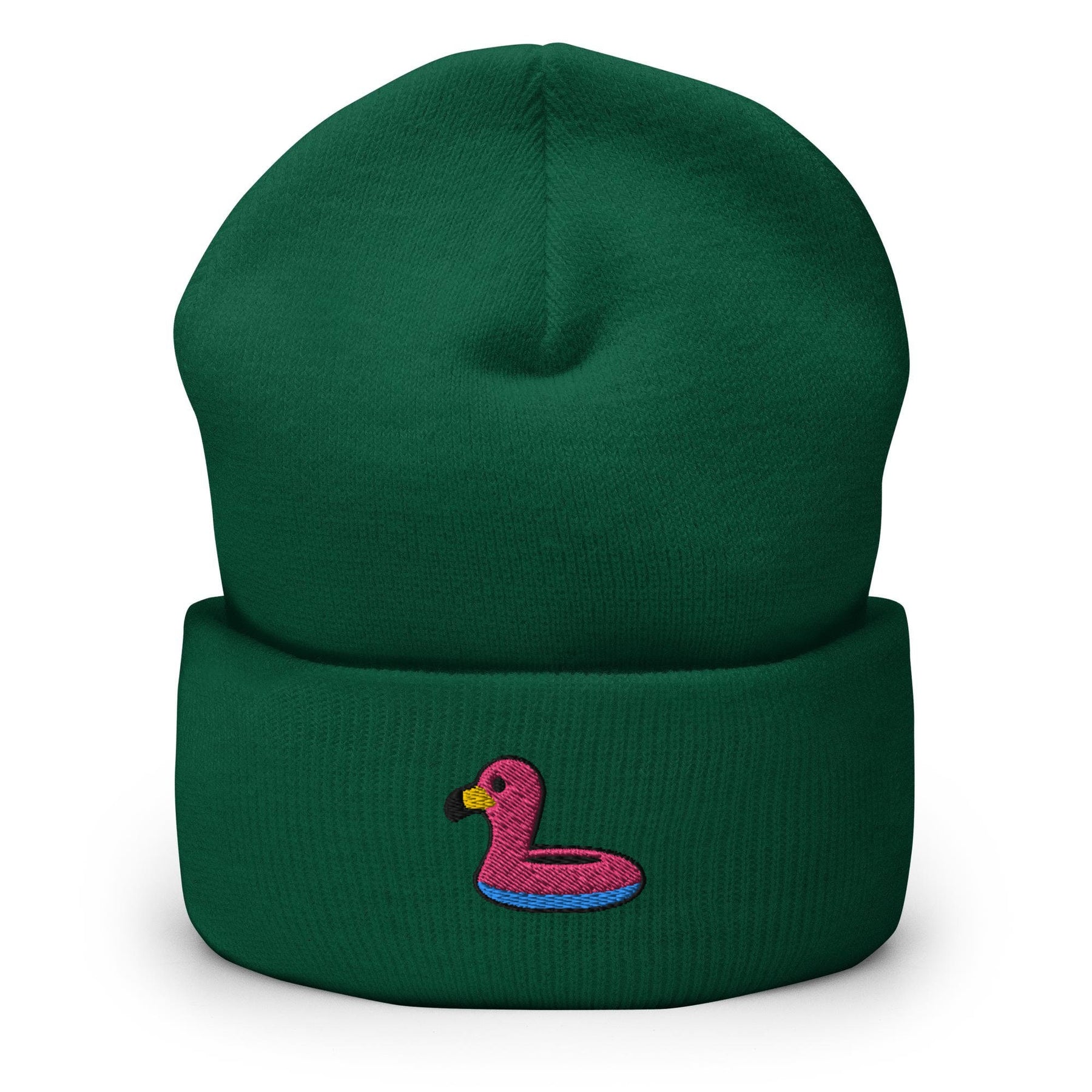 a green beanie with a pink flamingo on it