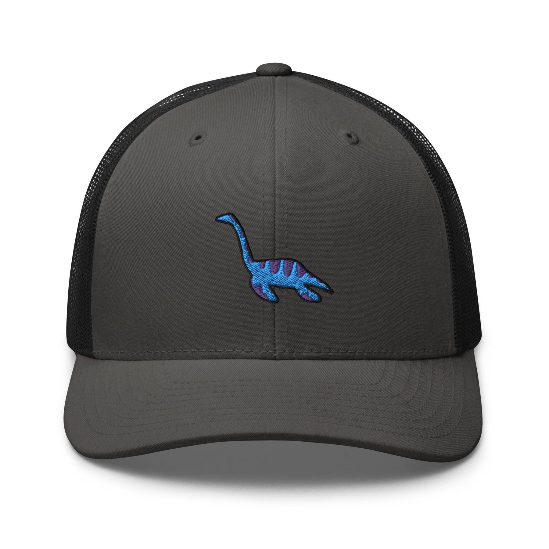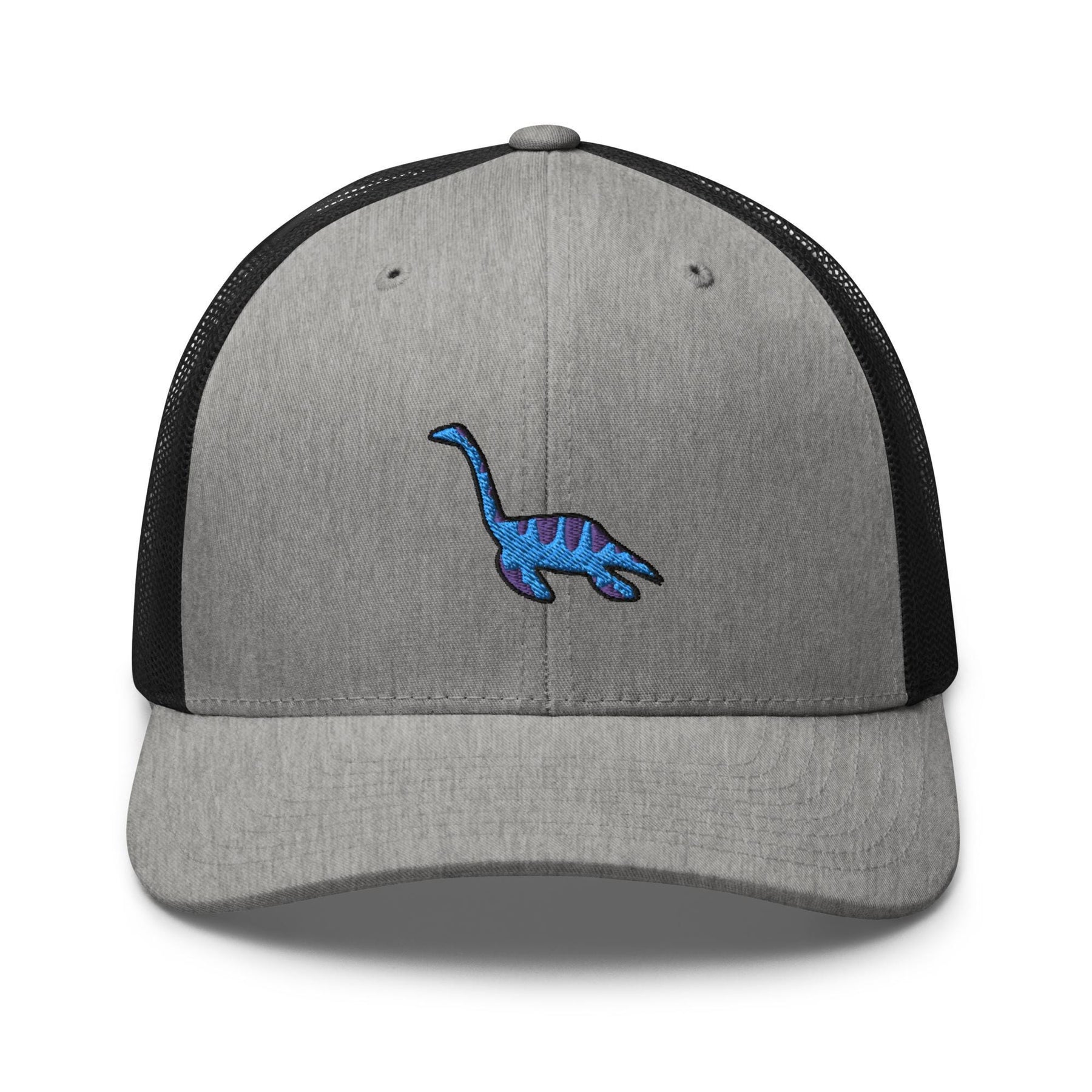 a gray and black trucker hat with a blue dinosaur embroidered on the front