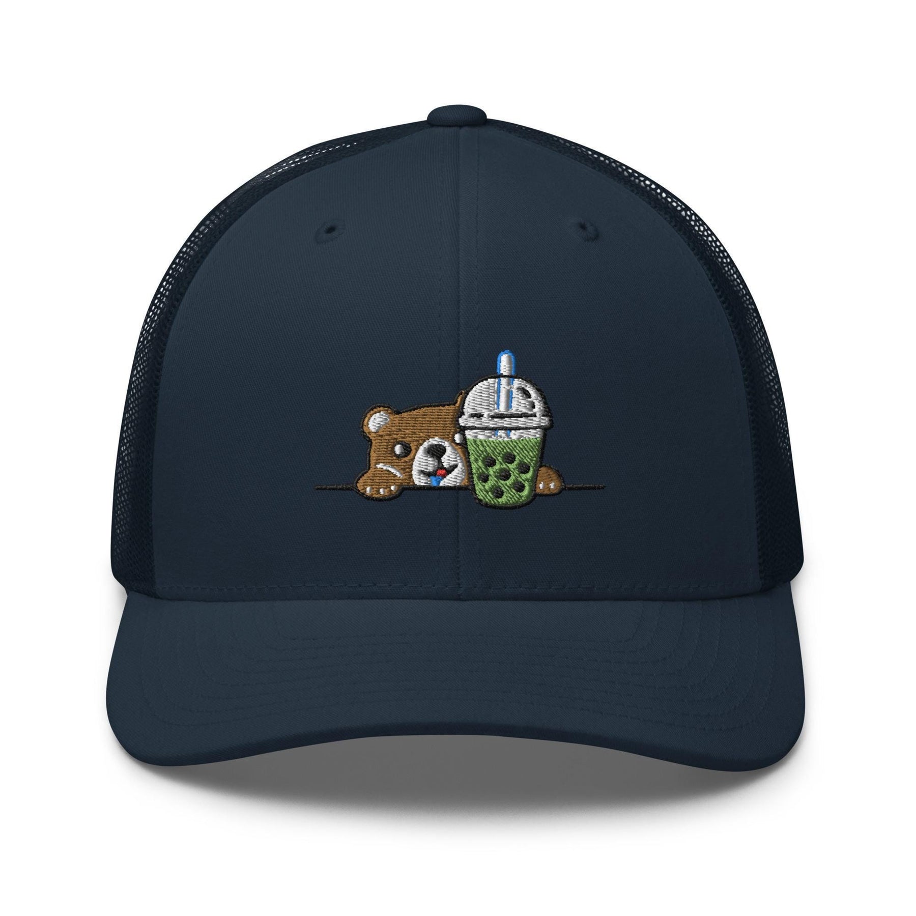 a blue trucker hat with a teddy bear hugging a cup of coffee