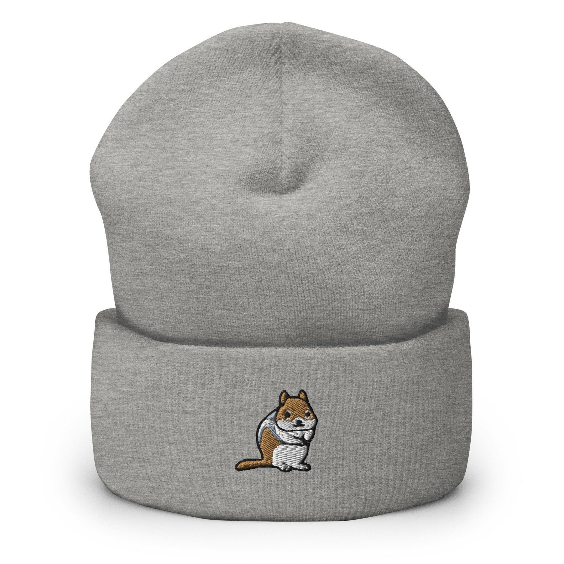 a grey beanie with a cartoon cat on it