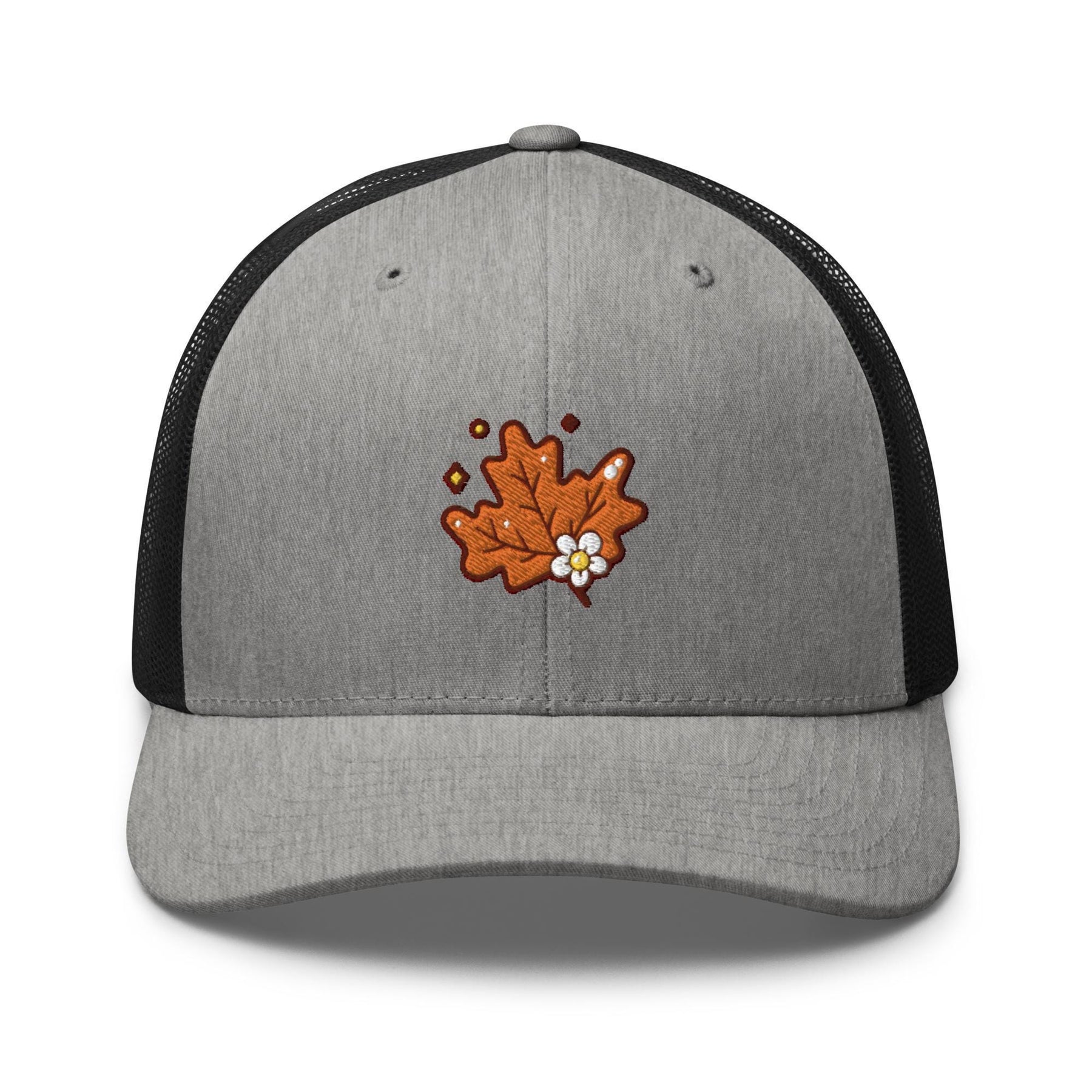 a gray and black trucker hat with an orange maple leaf embroidered on the front