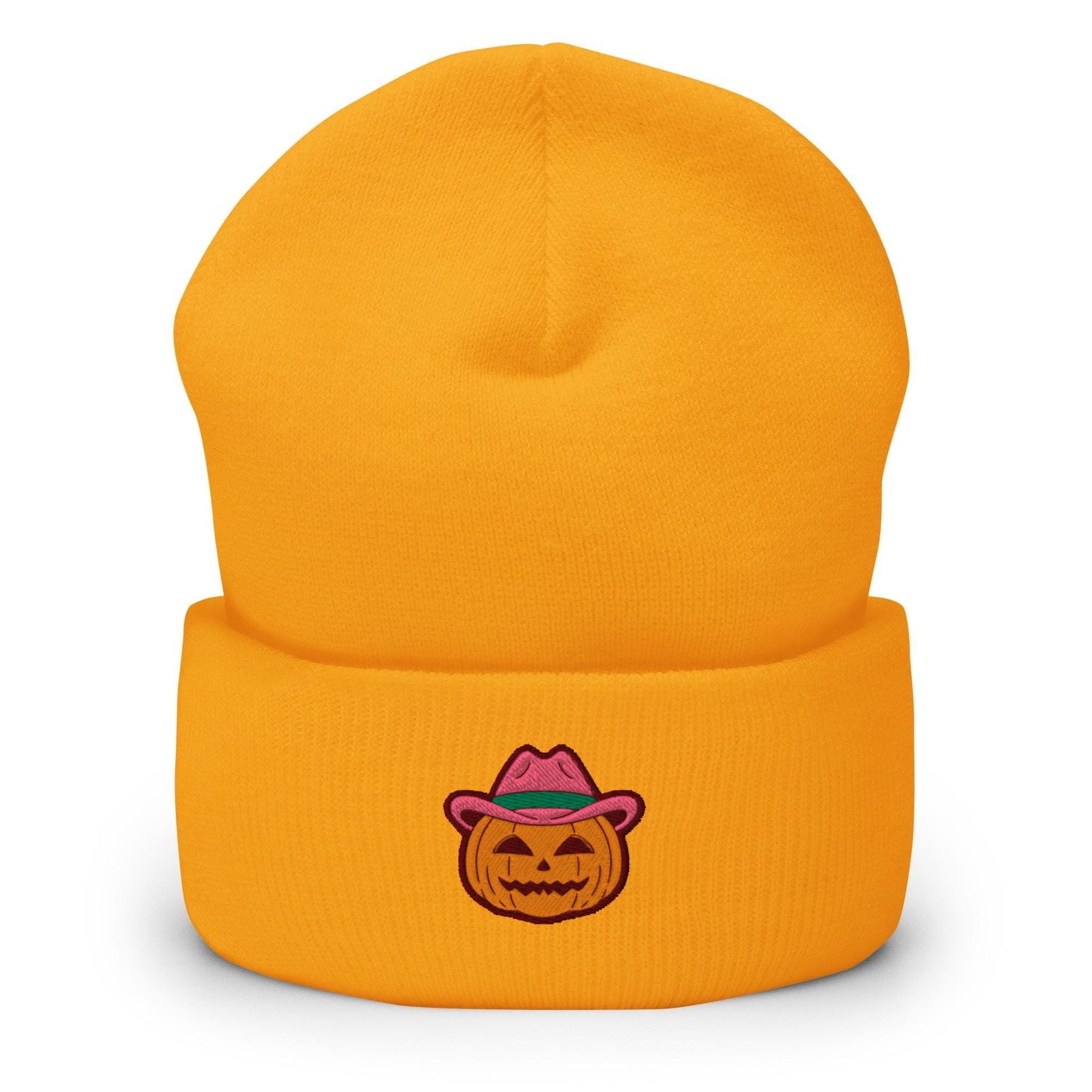 a yellow beanie with a cartoon pumpkin wearing a hat